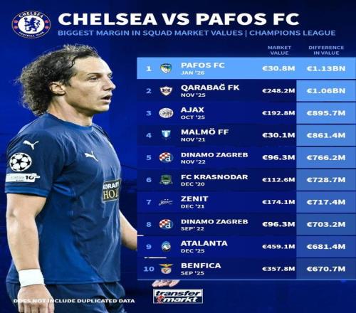 不够零头,帕福斯成为切尔西欧冠历史身价差距最大的对手